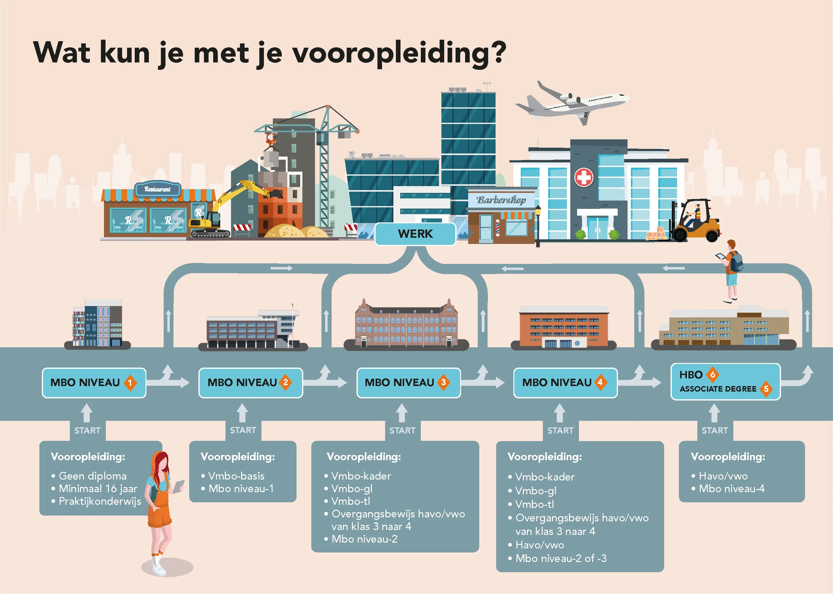 Jouw vooropleiding bepaalt voor welk mbo-niveau en uit welke opleiding je kunt kiezen. Bekijk hieronder wat de mogelijkheden zijn met jouw vooropleiding ⏬