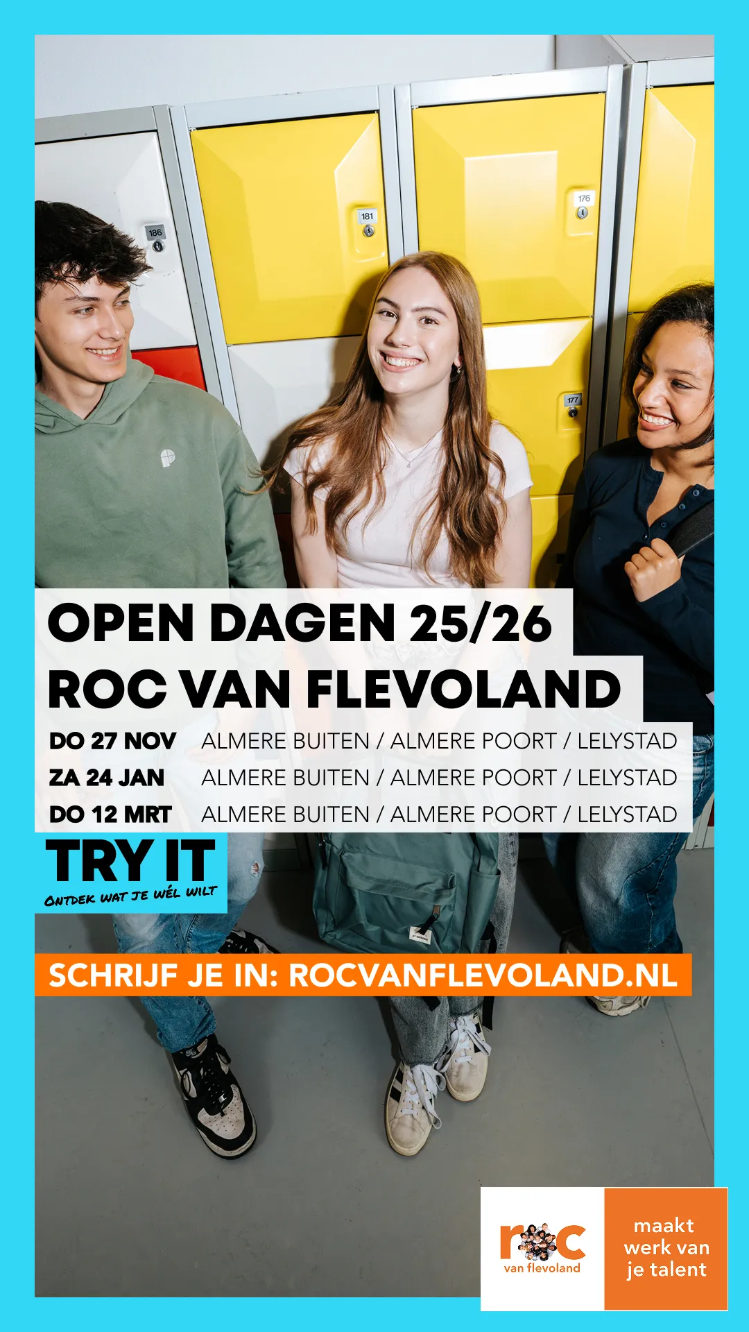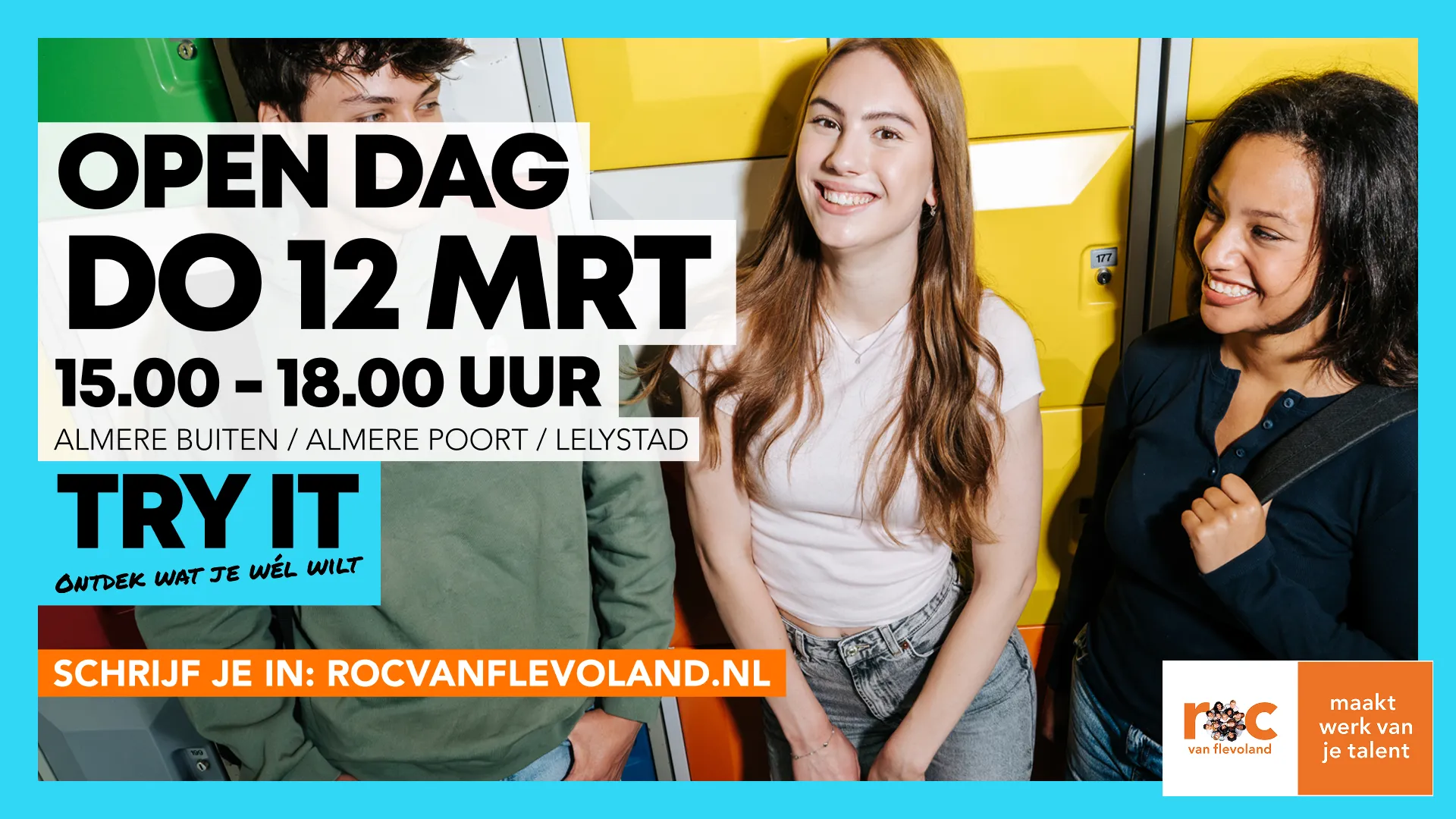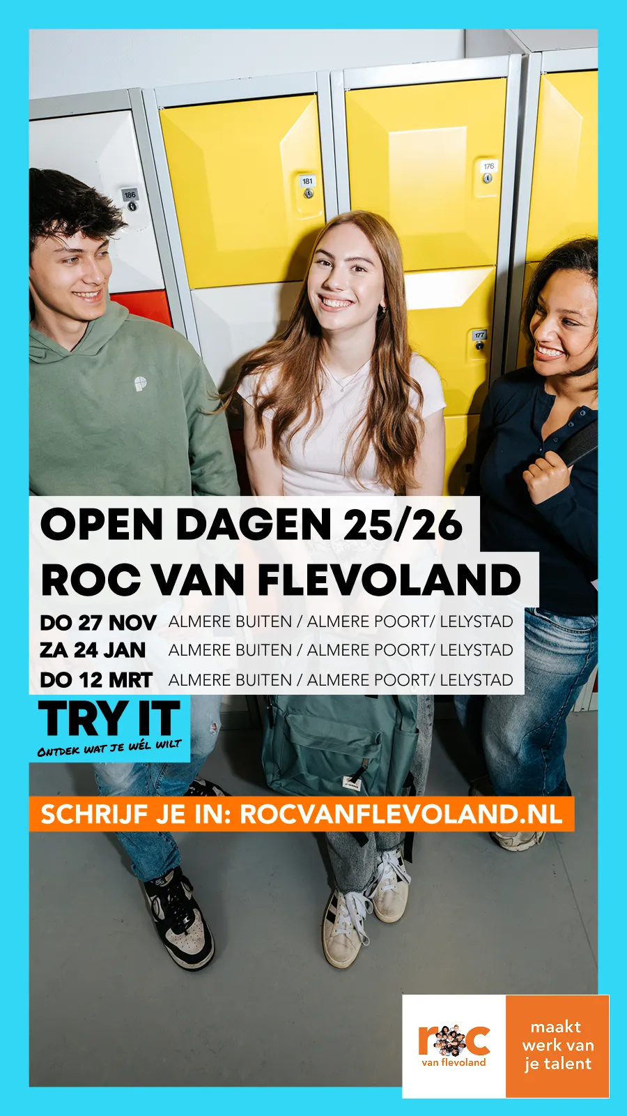 We ontvangen u graag tussen 14.45 - 15.00 uur onder het genot van een kopje koffie of thee. Tussen 15.00 - 16.30 uur vertellen wij u meer over het mbo in het algemeen, het ROC van Flevoland, onze drie colleges in Almere Poort, Almere Buiten en Lelystad, de doorstroom vmbo-mbo en de belangrijke rol van u als mentor in het studiekeuzeproces. We sluiten af met een hapje en drankje.