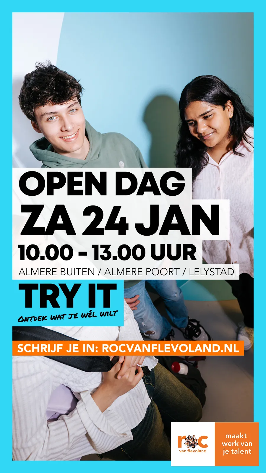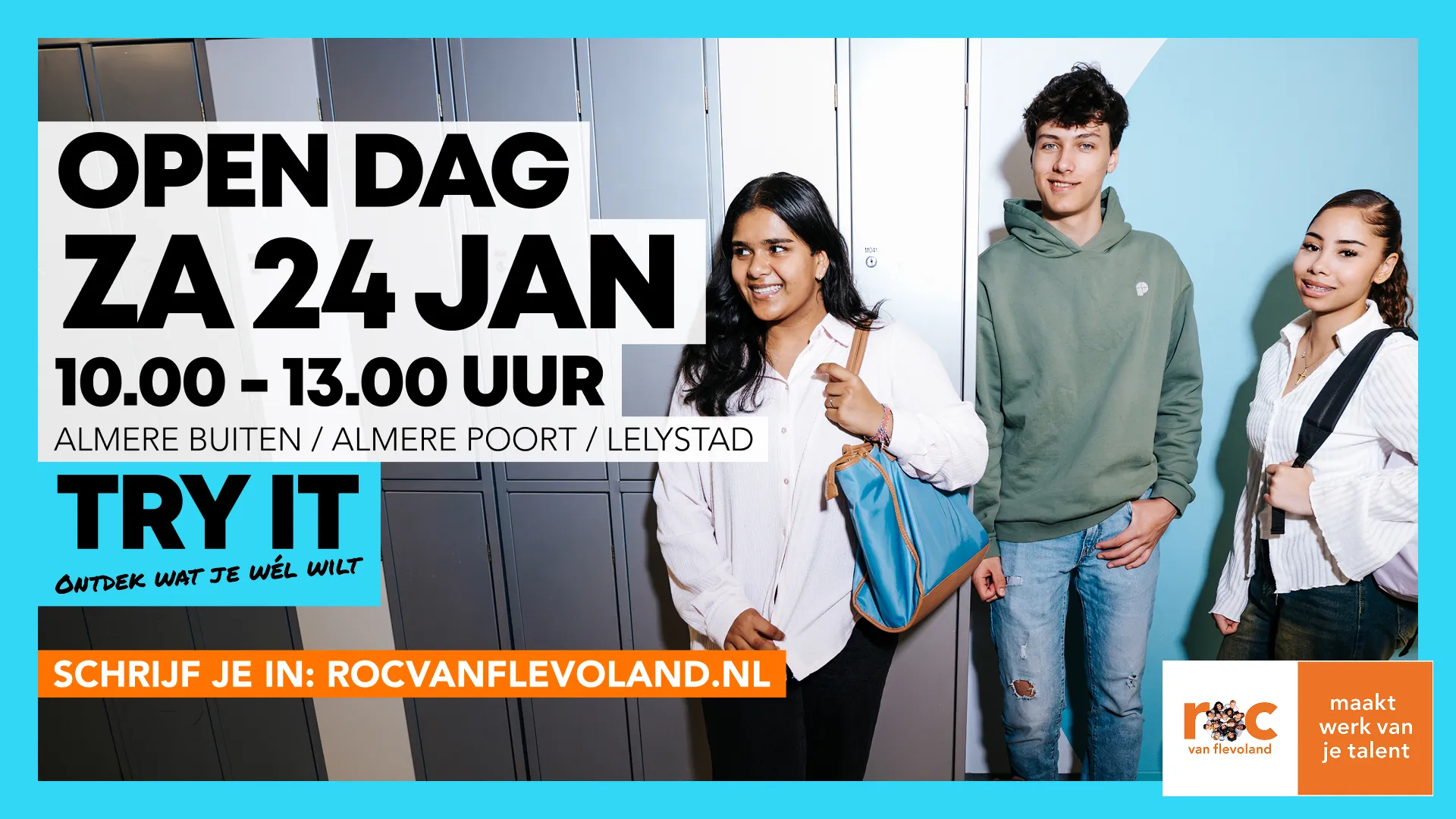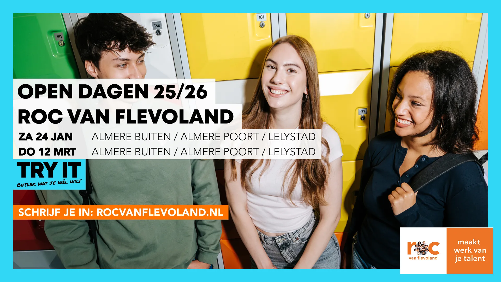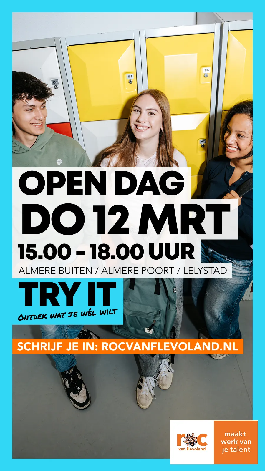 We ontvangen u graag tussen 14.45 - 15.00 uur onder het genot van een kopje koffie of thee. Tussen 15.00 - 16.30 uur vertellen wij u meer over het mbo in het algemeen, het ROC van Flevoland, onze drie colleges in Almere Poort, Almere Buiten en Lelystad, de doorstroom vmbo-mbo en de belangrijke rol van u als mentor in het studiekeuzeproces. We sluiten af met een hapje en drankje.